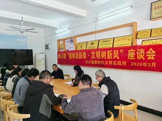 植树活动前,水口镇召开 “植树添新绿・文明树新风” 座谈交流会,组织与会人员深入学习贯彻习近平生态文明思想,围绕植绿护绿、生态治理、文明实践等主题交流心得、凝聚共识。大家一致表示,将充分发挥党员先锋模范作用,带动群众广泛参与、共建共享,把生态保护理念融入基层治理全过程,推动绿色发展理念在水口落地生根、开花结果,进一步凝聚护绿合力、夯实生态底色。