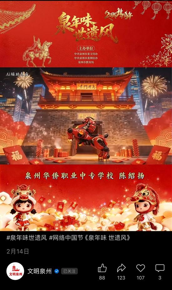 为深入学习贯彻习近平文化思想,落实“立德树人”根本任务,弘扬中华优秀传统文化,讲好节日故事,泉州市委文明办联合市委网信办、市教育局连续三年在春节、元宵节期间开展“泉年味·世遗风”系列活动。为期一个月的2026年“泉年味·世遗风”主题视频展播活动于2月6日启动,日前已正式落下帷幕。