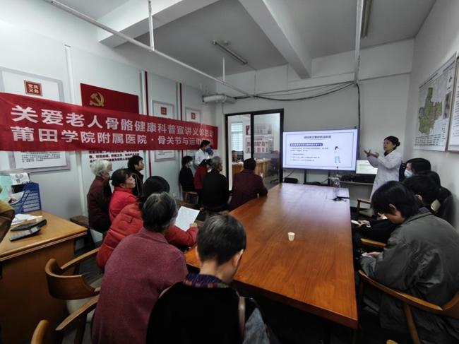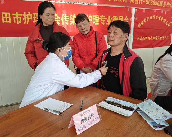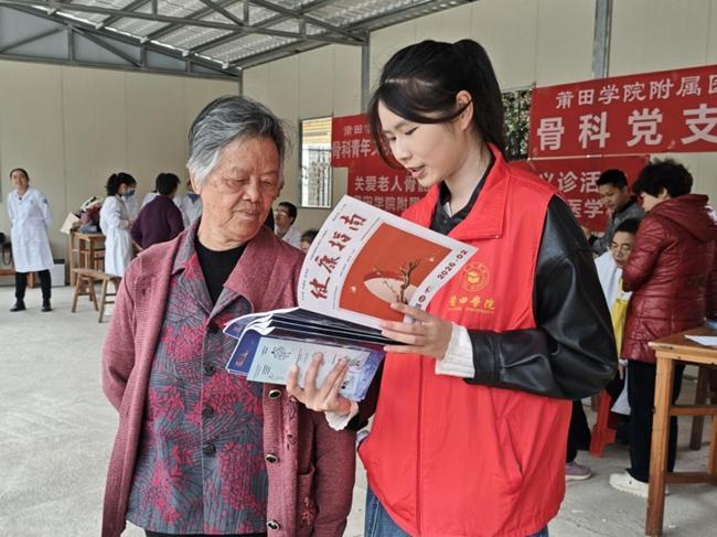 紧随校园宣讲之后,3月22日,莆田学院基础医学院联合附属医院组建专业医疗志愿服务队,深入涵江区白塘镇显应村,将优质医疗服务送到群众“家门口”,切实解决基层群众就近就医和健康咨询的迫切需求。活动现场,结核病科医生朱林剑以“健康呼吸,从防治结核开始”为主题开展科普宣讲,结合乡村群众生活习惯,用接地气的语言、真实鲜活的案例,详细解读结核病的危害、防治要点及国家相关防控政策,让防治知识听得懂、记得住、用得上,为现场群众上了一堂生动实用的健康必修课。“提重物要注意卸力,不能瞬间发力,避免关节损伤。”运动医学科医生陈国立一边为村民讲解日常防护技巧,一边现场示范正确发力方式。与此同时,骨科医生为村民逐一检查关节、诊断常见骨科疾病,耐心示范康复训练动作,细致叮嘱日常保养要点;基础医学院志愿者们则向村民分发健康宣传材料,围绕结核病、慢性病、骨科常见疾病等群众关心的健康问题,开展一对一科普讲解和咨询服务,将科学的健康理念传递到每一位群众心中,用实际行动温暖民心。