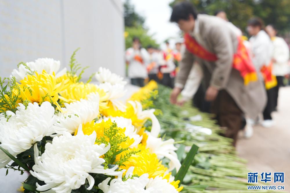 3月29日,学生代表向福州革命烈士英名墙敬献鲜花,缅怀英烈。新华网 肖和勇 摄
