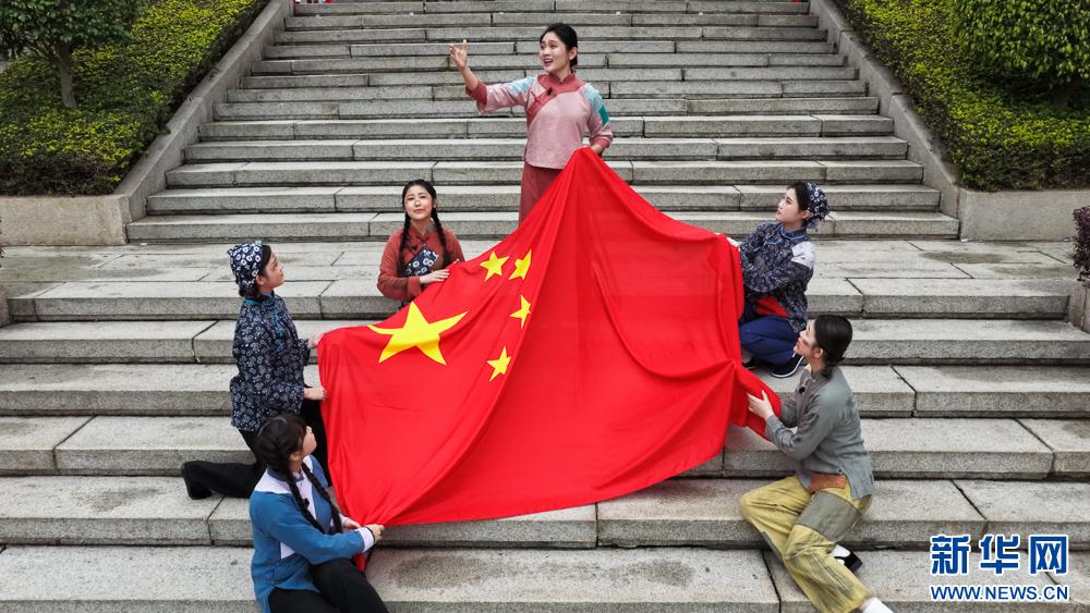 3月29日,演员在“铁血铸魂”篇章中演唱红色主题歌曲《绣红旗》(无人机照片)。新华网 肖和勇 摄