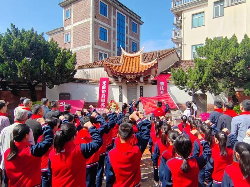 上午9时,活动正式拉开帷幕。现场庄严肃穆,全体人员整齐列队、佩戴红领巾。仪式依次进行出旗、奏唱国歌与少先队队歌、讲述英烈事迹、敬献花篮与鲜花、集体默哀、三鞠躬等环节,深切追思革命先辈的英勇壮举与奉献精神。党员代表重温入党誓词,少先队员重温入队誓词并庄严呼号,铿锵誓言彰显传承红色基因、勇担时代使命的坚定决心。现场还组织党员干部、师生代表瞻仰烈士亭,参观闽中游击队驻珠江中队遗址纪念馆,观看馆内珍贵的图片、文字、实物展示,聆听红领巾讲解员讲述英烈们的生平事迹,近距离感悟革命先辈英勇顽强、不畏牺牲的斗争精神。