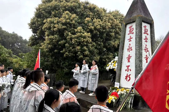 悠扬又深情的《献花曲》缓缓响起,学生代表满怀崇敬,小心翼翼地抬起花篮,缓步走向烈士纪念碑,将花篮整齐摆放后,细心整理缎带,以此向革命先烈致以最崇高的敬意。全体师生脱帽肃立,默哀三分钟,以无声的思念寄托对先烈的深切缅怀,也在这一刻更加懂得如今幸福生活的来之不易。默哀仪式结束后,学生们分组前往烈士墓区,俯身用干净的毛巾细细擦拭墓碑上的尘埃,认真清理墓冢周边的杂物,随后为每一座烈士墓敬献鲜花,用这朴素而庄重的举动,表达对革命先烈的缅怀与敬仰之情。