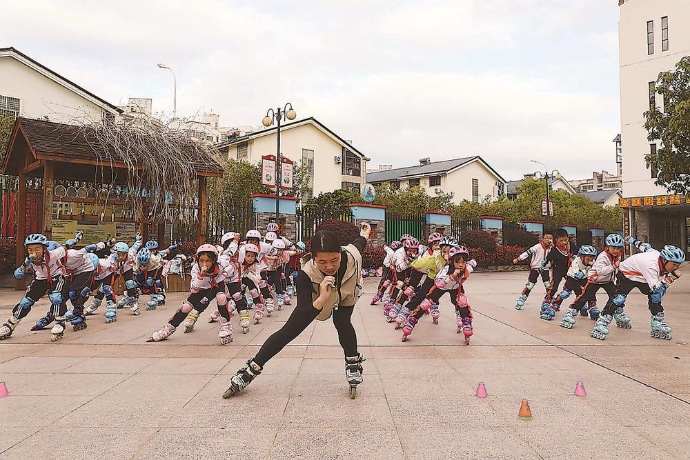 7日,宁化县第二实验小学下课铃响后,学生们纷纷跑向操场,有的跑步,有的踢球,还有的以最快速度换好轮滑鞋,在操场上尽情驰骋,划出一道道灵动的轨迹,校园里处处洋溢着活力与朝气。