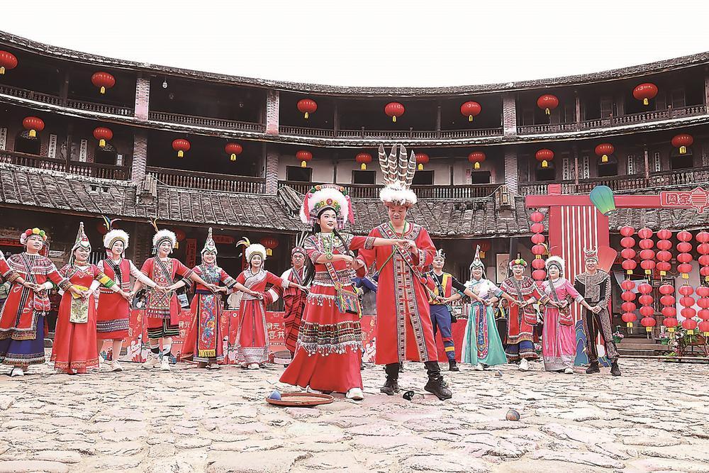 春节期间,华安创新推出“土楼国潮寻宝记”沉浸式剧本游和“非遗奇妙夜”两大体验产品,让游客感受到“一种叫华安的生活”。“世遗土楼浑圆的轮廓就是天然舞台,少数民族的歌舞就是特色节目。”华安县文化馆馆长张金梅说。