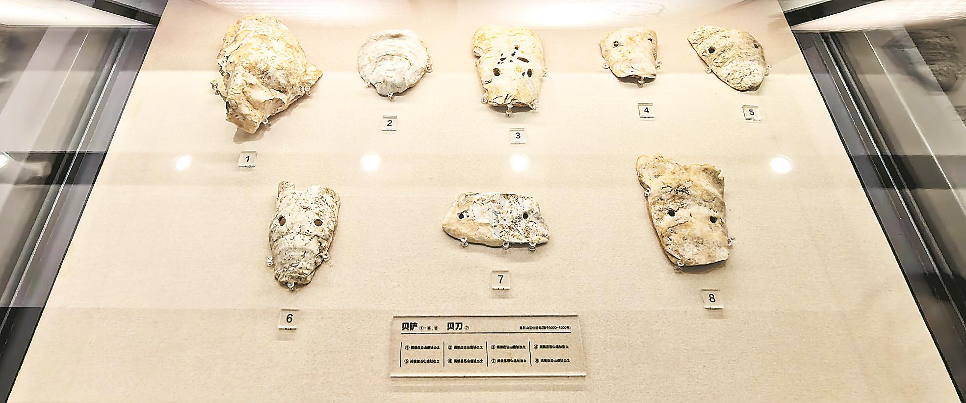 展厅众多出土文物中,最具地域特色的莫过于用海蛎壳磨制而成的贝铲与贝刀。