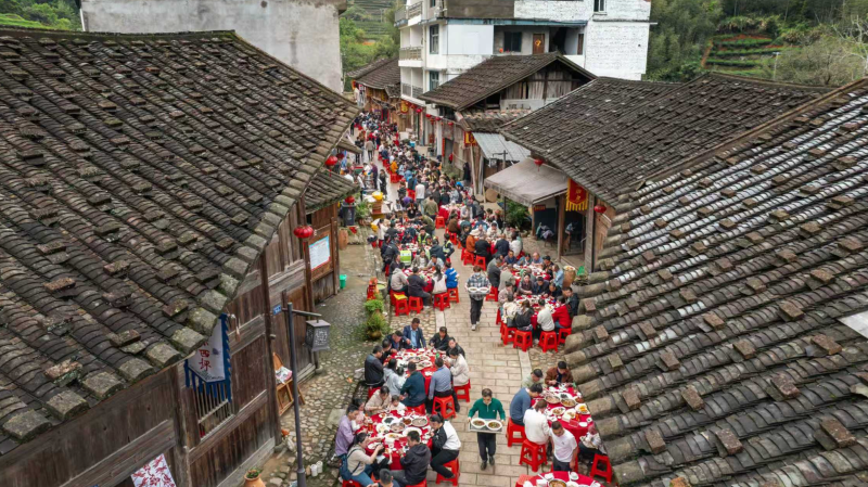 中午时分,西坪村古街上“百家宴”依次排开,座无虚席。游客围坐一堂,品尝融合“状元文化”与宅中硒锌特色食材的状元琼宴,欢声笑语回荡古街,文明就餐、礼让互助的举止也悄然成为一道风景。