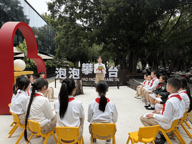 活动现场,静默的树桩成为孩子们创意绽放的舞台。五支小学生队伍依次登上“泡泡攀讲台”,自信分享各自团队的设计理念与手绘作品,每一份分享都满含童真巧思,赢得现场阵阵掌声。