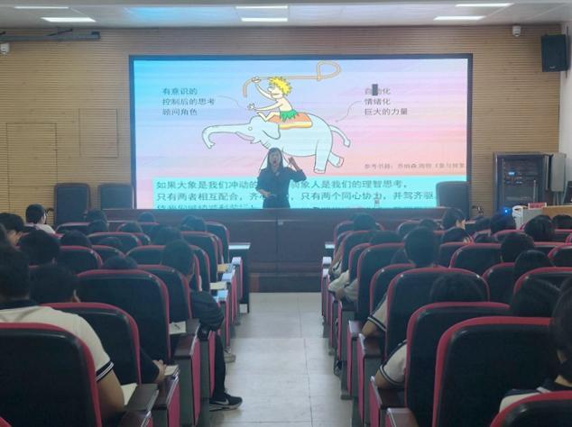 游思萍老师运用“大象与骑象人”心理学比喻,深入浅出地讲解情绪与理智的关系:将冲动情绪比作力量强大、易受本能驱使的大象,将理性思考比作把握方向的骑象人,引导学生正确认识情绪、接纳情绪,学会做情绪的主人。结合典型案例,老师详细讲解“情绪红绿灯”调节法,教导同学们通过“红灯停、黄灯想、绿灯行”三步法理性处理矛盾与压力。同时,现场传授“五感解压法”,从视觉、听觉、嗅觉、味觉、触觉五个维度,为同学们提供简单易行的日常减压技巧,实用性强、易于掌握。