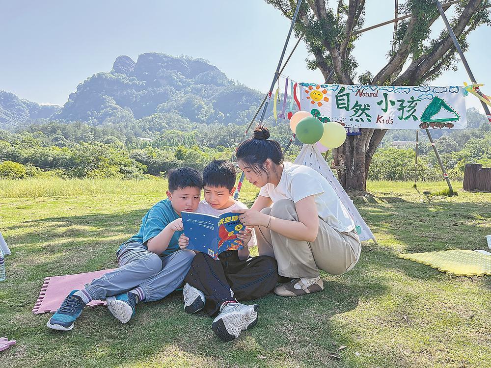 春日的冠豸草山草木葱茏、清风拂面,家长与孩子并肩围坐,翻开一本本趣味绘本,时而轻声共读,时而分享阅读感悟,稚嫩的童声与温柔的讲解声在山野间回荡。