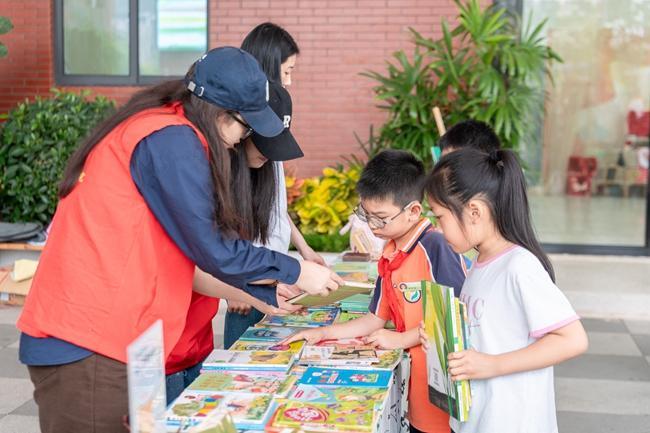 同学们在“漂读区”交换新书。福清市新时代文明实践中心 供图