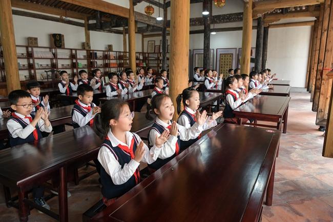 桃城镇中心小学二年级学生在明伦堂进行经典诵读展演