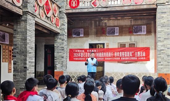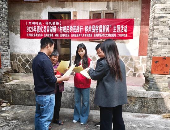 活动现场。美湖镇 供图 为弘扬文明新风,进一步引导群众自觉践行村规民约、主动参与移风易俗,近日,中共德化县委宣传部、美湖镇新时代文明实践所、美湖司法所等部门单位在美湖镇民俗文化馆共同开展“村规民约我践行 移风易俗倡新风”主题活动,以法治宣讲润民心,让村规民约落地生根,让移风易俗深入人心。 “《民法典》倡导文明健康、绿色健康的生活方式,咱们村规民约提出婚事新办、丧事简办,既能减轻家庭经济负担,又杜绝了铺张浪费,让口袋里的钱真正用在‘刀刃’上!”。活动现场,美湖镇“蒲公英”普法志愿者以“法治课+拉家常”的形式,将《民法典》与村规民约深度融合,聚焦农村高频民生场景,运用朴实生动的“家常话”,结合群众身边鲜活案例,围绕婚丧嫁娶、垃圾分类、村容村貌、生态环境保护等实际问题展开解读,引导大家深入认识村规民约,从点滴做起,共同营造和美幸福的邻里关系。“以前总觉得法律和村规民约离我们很远,今天才认识到,每一条都和咱们的日子息息相关,既护着厝边和睦,又能帮咱们省下开支,以后肯定好好遵守”,村民陈阿姨颇有收获地说道。