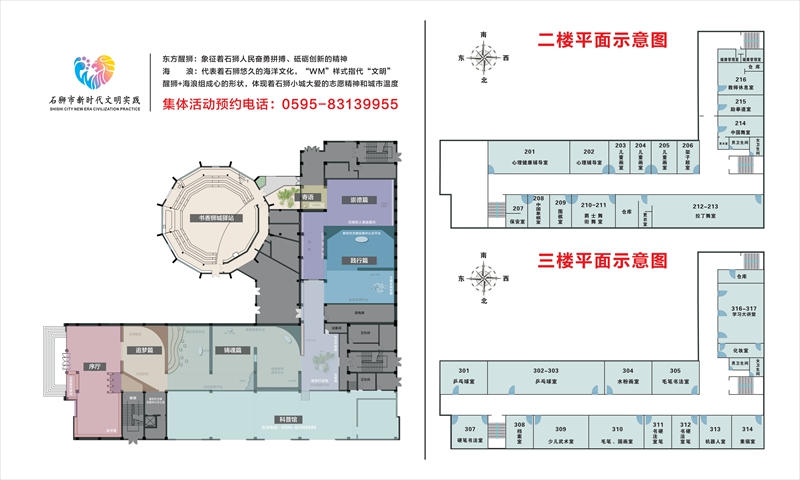石狮市新时代文明实践中心建成于2020年底,总面积9000㎡,是兼具宣教、展示、互动、服务等功能为一体的综合平台,也是辐射全市文明实践所、站、点的指挥中心、服务中心,并与周边的博物馆、文化馆、音乐厅、体育馆、职工之家等文明实践点,构成新时代文明实践矩阵。