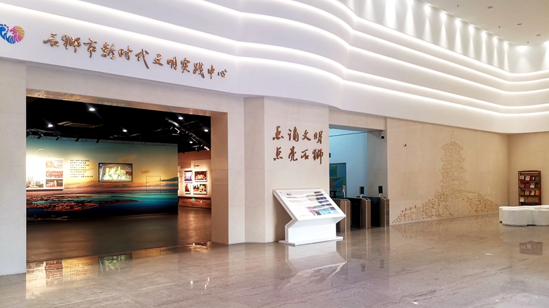 序厅设有导览图,介绍中心一楼主体区域的追梦、铸魂、践行、崇德等五个篇章,二楼以上功能室及左右配套建设的书香狮城驿站和科普馆。同时,序厅展示了石狮市新时代文明实践中心原创logo。序厅左右两侧,介绍了石狮的地理标志:(1)用“砖雕”形式展示姑嫂塔,石狮姑嫂塔是宋元时期泉州港的海上航标,放在这里象征着文明实践中心在文明创建中有引领、导航的作用。(2)在“出砖入石”墙壁上用3D影像技术对石狮凤里老街的隋代石狮子进行了还原。当时,“石狮子”所在的地方是通往泉州府的官道,人们往往相约在此前往泉州经商办事,久而久之“石狮”就成为地名,石狮人经商、诚信的城市基因也发源于此。