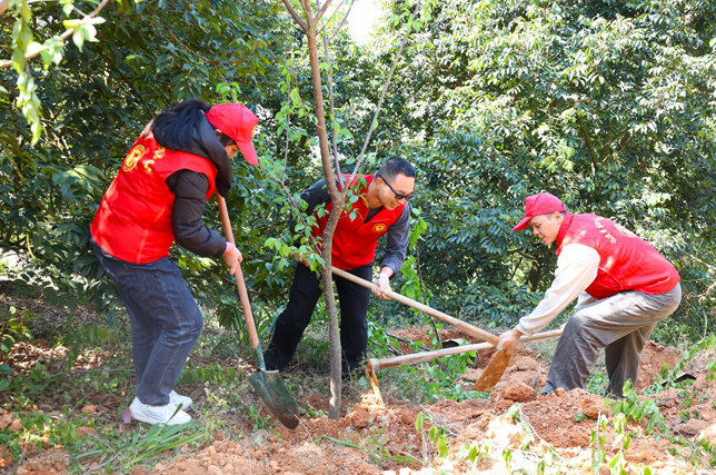 活动中,大家脱下厚重的外衣,纷纷卷起袖子,拿起铁锹、锄头、水桶,掘土、覆土、夯土、搬苗、扶苗、浇苗……挥洒汗水,埋头苦干,有的手起茧了、磨破了,有的累得站不稳,却仍然坚持,齐心协力地让一棵棵树苗向阳挺立,迎风招展,让山坡再添一抹抹新绿。