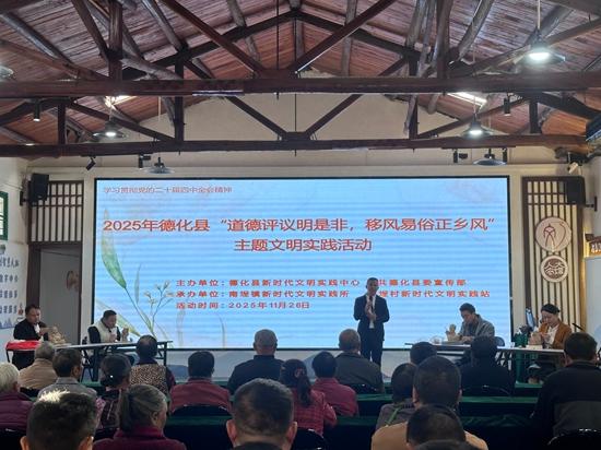 文化特派员张明贵进行微宣讲。南埕镇 供图 文明风12月1日讯 为深入贯彻落实党的二十届四中全会精神,11月26日,德化县新时代文明实践中心、县委宣传部(文明办)、南埕镇在南埕镇新时代文明实践所联合开展“道德评议明是非,移风易俗正乡风”主题宣传宣讲活动。 小微宣讲倡导新风落实。活动现场,德化县级文化特派员张明贵作为南埕本地人,用群众熟悉的“家乡话”,结合自身的求学创业和教学实践经历,讲述“恪守诚信、涵养品德”的重要性,引导村民诚信待人、和谐邻里。活动中,张明贵还宣读了《移风易俗倡议书》,“自觉抵制高价彩礼、大操大办……传承孝老爱亲、厚养薄葬好风尚……”一句句掷地有声的倡议,既明确了移风易俗的具体要求,更提高了群众对新风尚的认识。
