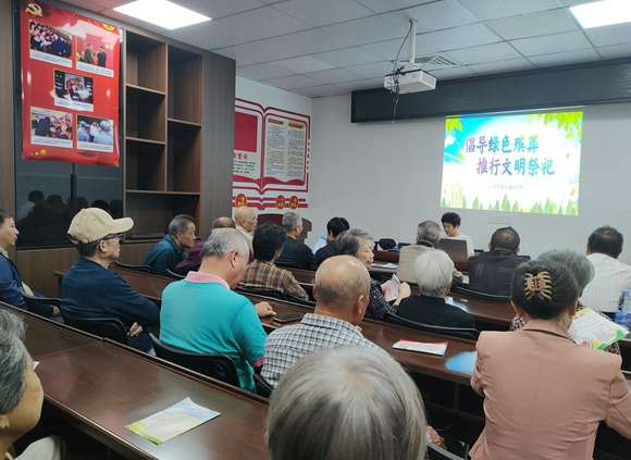 西门社区开展“倡导绿色殡葬,推行文明祭祀”主题讲座 聚焦绿色祭祀,倡导文明新风 围绕“绿色殡葬·文明祭祀”主题,西门、凤东、东门等社区及苏区村先后组织开展宣传活动。11月7日,西门社区新时代文明实践站举办“倡导绿色殡葬,推行文明祭祀”主题讲座,辖区50余名居民代表参加。活动通过案例讲解,围绕“婚事新办、丧事简办、节庆俭办”等内容,深入浅出地介绍了移风易俗的重要意义,倡导居民自觉抵制大操大办、铺张浪费等不良风气。11月13日,凤东社区联合县政府办在蓝波湾小区及长者食堂开展宣传,志愿者向居民讲解焚烧纸钱、抛洒冥币对环境的危害,引导大家选择更为低碳、安全的缅怀方式。11月19日,东门社区新时代文明实践站组织志愿者走进小区,开展“厚养薄葬传美德,文明殡葬树新风”宣传,重点讲解“丧事简办”的意义,不少居民现场表示认同并愿意践行新风尚。11月21日,苏区村通过发放宣传单,向村民普及绿色殡葬知识,推动文明理念向乡村延伸。