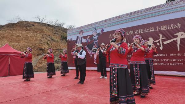 现场文艺表演。古田县融媒体中心 供图 祈福仪式上,福建省政协派驻新建村第一书记彭丰春表示,“长寿畲村千叟宴”是“中国村节”系列文化活动的重要组成部分,以“福门孝道”文化为核心,以“迎春纳福”为场景,依托畲族寿庆“全村同庆、唱颂祈福”的传统习俗,以“畲族十大碗”为文化载体,充分展现畲族药膳智慧与饮食文化。活动旨在凝聚乡情、弘扬畲族文化,号召各方参与孝老敬老,助力“旅居康养,长寿畲村”文化IP建设及乡村文旅融合。