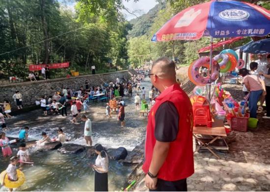 假期,志愿者将在景区开展常态化在岗值守。林钰妮 供图 志愿者们化身“环境美容师”,手持工具对重点区域杂草、垃圾、杂物进行“拉网式”清理,不留卫生死角;同时化身“安全引导员”,悬挂安全警示标语、常态化在岗值守,为群众提供路线指引、防暑建议,耐心劝导危险行为,既提升乡村颜值,也筑牢出行安全屏障。 防汛演练强本领 未雨绸缪防风险 近日,德化县气温回升期间,短时强降雨、强对流天气频发,山区防汛形势严峻,休闲游玩区域安全防范压力加大。为防范化解汛期安全隐患,提升突发险情应急处置和人员转移避险能力,龙门滩镇精心部署,组织开展防汛安全应急演练。 演练前明确各环节职责分工,演练中模拟突发强降雨、河道水位暴涨等险情,各工作小组协同作战,高效完成预警传递、人员疏散、应急抢险、物资调配等任务。此次演练既检验了应急预案的实用性,也锤炼了工作人员应急处置能力,为汛期群众及游客出行筑牢安全防线。 入户宣讲树新风 文明理念广传播 文明是最美的风景。为让文明理念深入人心,龙门滩镇以新时代文明实践活动为载体,组织志愿者走进村居街巷、沿街商铺、群众聚集地,开展“文明旅游·安全出行”主题宣传活动。