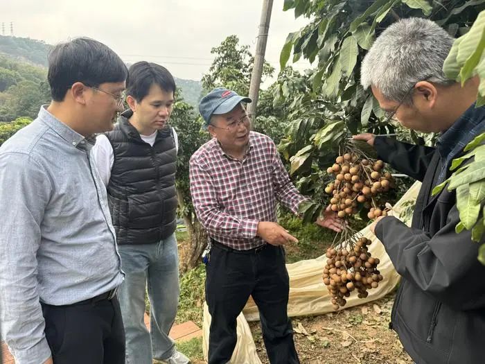 郑少泉查看“玖龙”龙眼生长情况(右二)