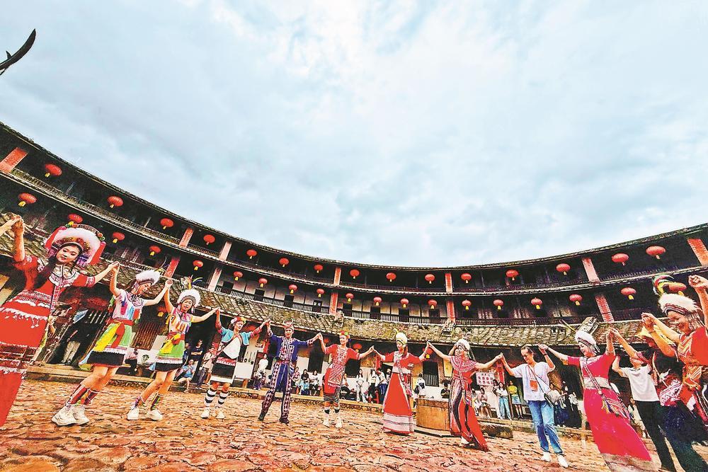 在华安县的二宜楼里,游客跳起拉手舞。 游斐渊 摄