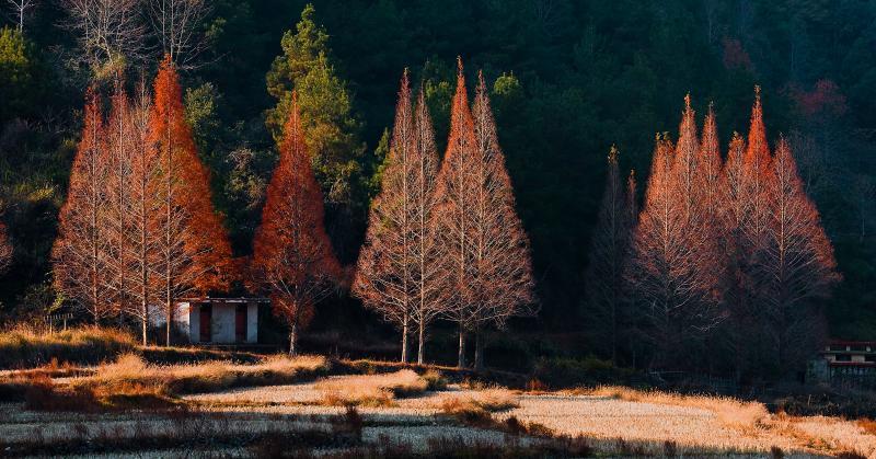 龙栖山的森林康养小镇是国家级自然保护区、省级森林康养基地,秋季的龙栖山是一年中最绚烂的时节,保护区内著名的水杉大道迎来高光时刻,叶片由绿渐黄转红,色彩斑斓,挺拔的树冠与蜿蜒的道路构成一幅层林尽染的油画,成为游客争相打卡的“金色大道”,也被评为“全国百佳红叶观赏地”。