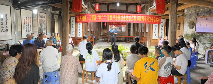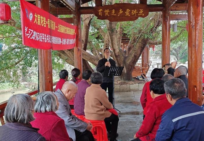 “星火相传 习语领‘杭’”基层理论宣讲上杭县通贤镇开展学习习近平总书记来闽考察重要讲话精神宣讲 (三)聚焦“讲活”,以生动场景推动宣讲“热起来” 用好乡村文化会客厅、农家书屋、文化广场等阵地,将讲台搬到凉亭、长廊、田间地头等场所,采用“理论宣讲+文艺表演”“集中授课+实地观摩”“现场交流+分组讨论”等通俗易懂的语言、鲜活多样的模式,让群众在寓教于乐、潜移默化中学习新思想新知识。推出“同学少年说”“红古田·红故事”“新思想·薪火传”“上杭90秒”等系列微视频300多期,广受群众好评。 “星火相传 习语领‘杭’”基层理论宣讲走进城南社区乡村文化会客厅开展文明实践理论宣讲 二、实施成效 (一)举旗定向,推动党的创新理论深入人心 高举习近平新时代中国特色社会主义思想伟大旗帜,牢牢把握时代主题和群众思想脉搏,用百姓话把“大道理”转化为“小故事”,让党心民心紧密相连、同频共振,激发广大基层干部群众投身发展事业的热情,增进干部群众对习近平新时代中国特色社会主义思想的政治认同、理论认同、思想认同和情感认同。 (二)以文化人,增强人民群众文化自信 充分发挥红色、客家、生态等丰富文化资源优势,引导广大干部群众更加深入了解上杭革命斗争史、客家人文史、改革奋斗史,继承“听党话、跟党走”红色基因,弘扬“闹革命走前头,搞生产争上游”优良传统,发扬客家人“开拓进取、艰苦奋斗”“三千榔头八百斧,走出山门闯特区”精神气魄,激励全县上下感悟文化精髓、增强文化自信、筑牢思想根基、阔步时代征程。