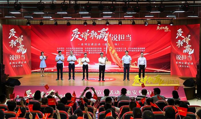 爱拼敢赢说担当主题宣讲(惠安专场) 二、实施成效 一是把话筒交给群众。 闽南语快板、掌中木偶、南音表演等文艺宣讲作品走进榕树下、古大厝、公园广场等“微舞台”,理论“翻译”成乡音土话,在沉浸式场景中弄懂党的创新理论。 二是把实事办到家门口。 拓展主题广场、便民生活圈、数字云平台等“15分钟宣讲圈”,广泛开展“宣讲+公益”“宣讲+三下乡”等普惠性活动,针对流动党员、特殊群体、在外务工人员等开展“专属学堂”“家庭课堂”“青年薯花微信直播读书会”等“宣讲+志愿服务”活动670余场次,让理论周周讲真正走进群众生活。 三是把课堂搬到指尖上。 依托惠安县融媒体中心开设“争优争先争效·深学争优”等专栏,实现“一机在手、理响万家”,真正把党的创新理论传到最远一家人、讲到最小单元格。