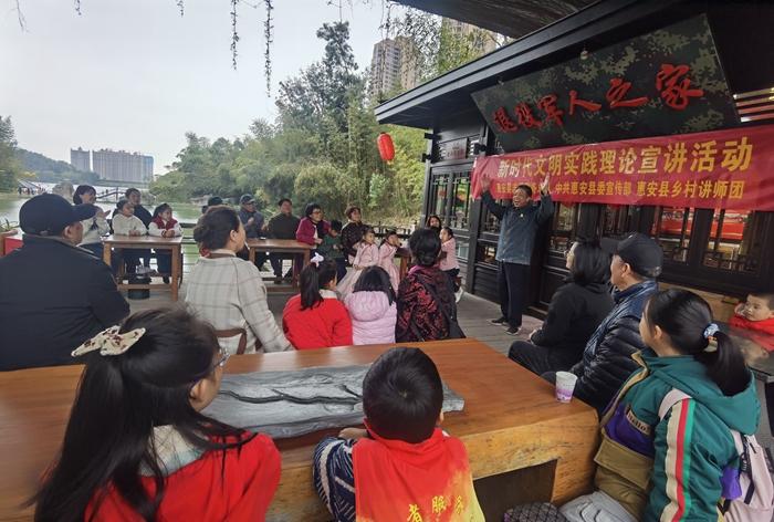 新时代文明实践理论宣讲活动走进聚龙小镇宣讲“邻里关系” (三)活动“下沉”,让理论响在基层 打造多维度、全覆盖新时代文明实践宣讲网络,依托1个文明实践中心、12个实践所、218个实践站、95个实践点,创设主、子课堂两级架构,利用县级“双中心”(新时代文明实践中心、融媒体中心)示范带动镇、村“微阵地”积极响应、广泛参与,持续掀起“周周齐开讲、月月出精品,全民共参与”的理论学习热潮。盘活公园街区、体育场所、闲置古大厝、南洋番仔楼等厝边“微阵地”,创新推出“惠明理·夜市思享汇”理论夜讲模式,创作惠女快板、闽南语四句、音乐党课等文艺宣讲精品86件,打造群众身边“可学、可品、可参与”的“理论移动驿站”。