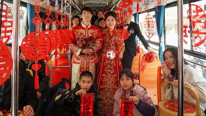 2025年1月21日,“95后”新人以公交车当婚车,树立婚嫁文明新风 二、实施成效 (一)婚嫁成本显著降低,群众负担切实减轻 自2023年专项治理以来,累计2391对新人登记结婚,其中低(零)彩礼1812对,高价彩礼占比相较2022年从42.5%大幅下降至24.2%。1676对新人主动选择低彩礼并享受“不送彩礼送保障”政策,占低彩礼新人的70.1%以上,形成了“为爱减负”的正向循环。 (二)社会风尚持续向好,文明新风蔚然成形 “谈婚论嫁先论价”的现象得到扭转,取而代之的是对新人未来发展的共同规划和对双方家庭的真诚关爱。通过选树示范户、举办集体婚礼、表彰先进典型等方式,营造了“不大操大办有面子、勤俭节约更光荣”的浓厚氛围。