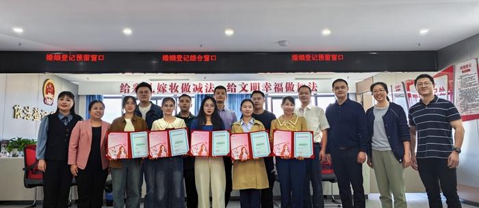 2023年10月18日,大田县妇联、民政局、文明办等为领证新人送上“康馨保” 三、社会影响 (一)获得高层肯定,示范效应凸显 2025年5月14日,国务委员、全国妇联主席谌贻琴同志在全国性重要会议上,对大田县“不送彩礼送保障”做法给予高度评价,称其为“很好的激励机制”。这一肯定极大地提升了该模式的权威性和影响力,使其从县域探索上升为国家层面关注和推广的典型经验,为各地开展同类工作树立了标杆。 (二)引发媒体聚焦,传播效应广泛 创新做法吸引了中央及省市各级媒体的广泛关注。福建电视台、《福建日报》等省级主流媒体先后以《为爱减负》《听民意、定标准、强保障》等为题进行深度报道。策划制作的7个移风易俗动漫公益短片、短视频《移风易俗 青年先行》等新媒体产品,全网总流量突破100万,形成了线上线下同频共振的强大宣传声势,将文明婚俗新风吹入千家万户。 (三)引领社会风潮,带动效应显著 通过邀请“零彩礼”家庭代表参加县委常委(扩大)会议、选派典型参加全国集体婚礼等活动,先进典型的示范引领作用被充分激发。周边县市纷纷前来学习取经,社会各界对婚俗改革的关注度和参与度空前提高。“大田经验”不仅改变了一地的风气,更推动了整个区域社会文明程度的提升。(大田县新时代文明实践中心) |