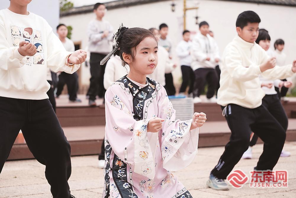 头戴“三条簪”的女孩习练鸣鹤拳。