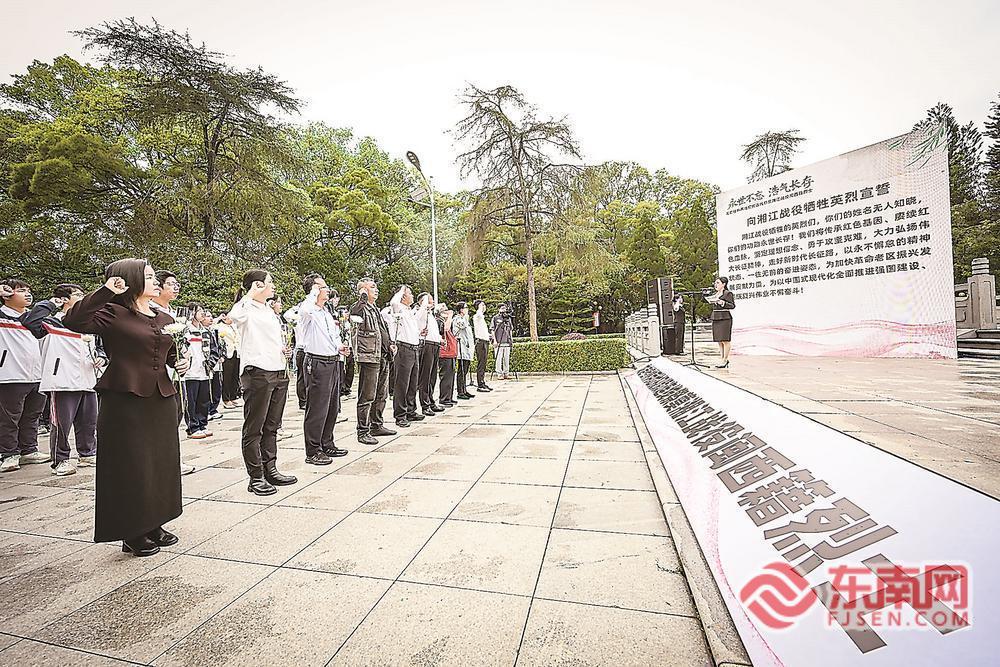 “绝命后卫,铁壁铜墙。凤凰嘴上,血染湘江……”诵读祭文的声音穿越屏幕,回荡在人们心间。礼毕,龙岩学院国旗护卫队学生缓步走向闽西革命烈士纪念碑敬献花篮;在桂林,由龙岩、三明两地共建的福建籍湘江战役红军烈士“坚定信念跟党走”雕塑前,人们凝神伫立,表达深切缅怀。