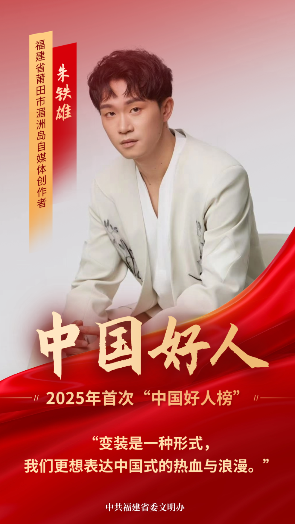 朱铁雄专注国风文化传播,全网粉丝超3600万。他演绎英雄人物,讲述人物故事,唤起亲情、友情、爱情等情感共鸣,重塑“中国超级英雄”。他以“变装为皮,剧情为骨,国风为魂”风格,让更多人了解传统文化美好,激发年轻人保护传承传统文化共鸣。[详细]
