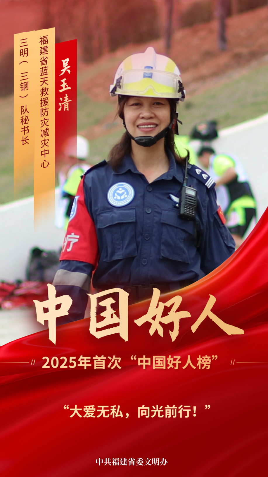 2013年,吴玉清加入福建省蓝天救援防灾减灾中心三明(三钢)队。她先后参与了云南鲁甸地震救援、尼泊尔地震救援、斯里兰卡水灾救援等国内外突发事件救援任务,累计达125次,服务群众12700人。[详细]